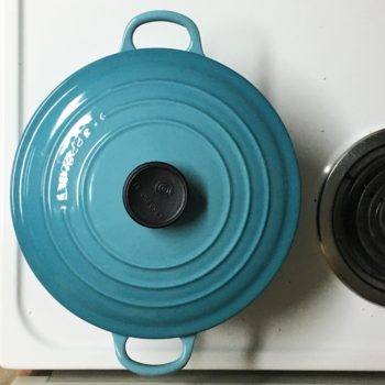 One of our post-quarantine outings included a trip to an outdoor mall. It was serendipitous that the Le Creuset outlet was having a sale. My wallet was lighter, but my hands held a beautiful teal colored enameled dutch oven and two stoneware bowls. This pot is among my favorite kitchen purchases ever, and I can’t believe it took me so long to do the thing.