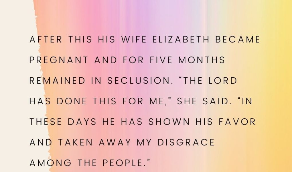 It’s also possible Elizabeth withdrew to spend time meditating. Her life and all the expectations she had of her and Zechariah living out their twilight years together are about to change drastically.